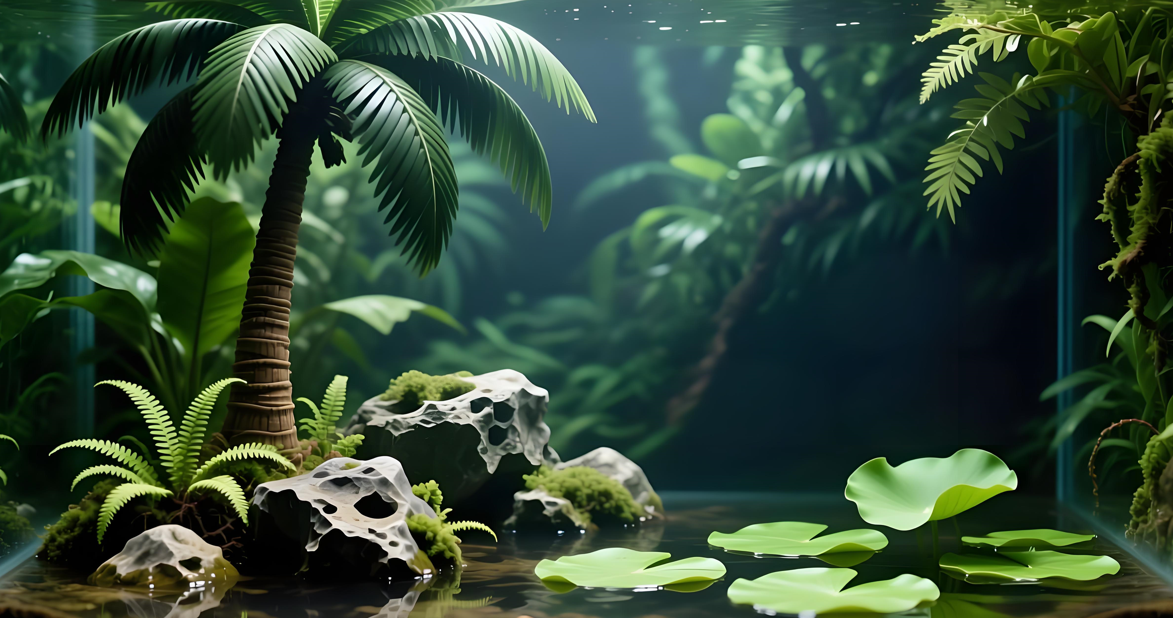 - Lighting – Soft, diffused light filters through the water, casting a gentle glow that highlights the plants, palm tree, and rocks, enhancing the overall ethereal atmosphere.