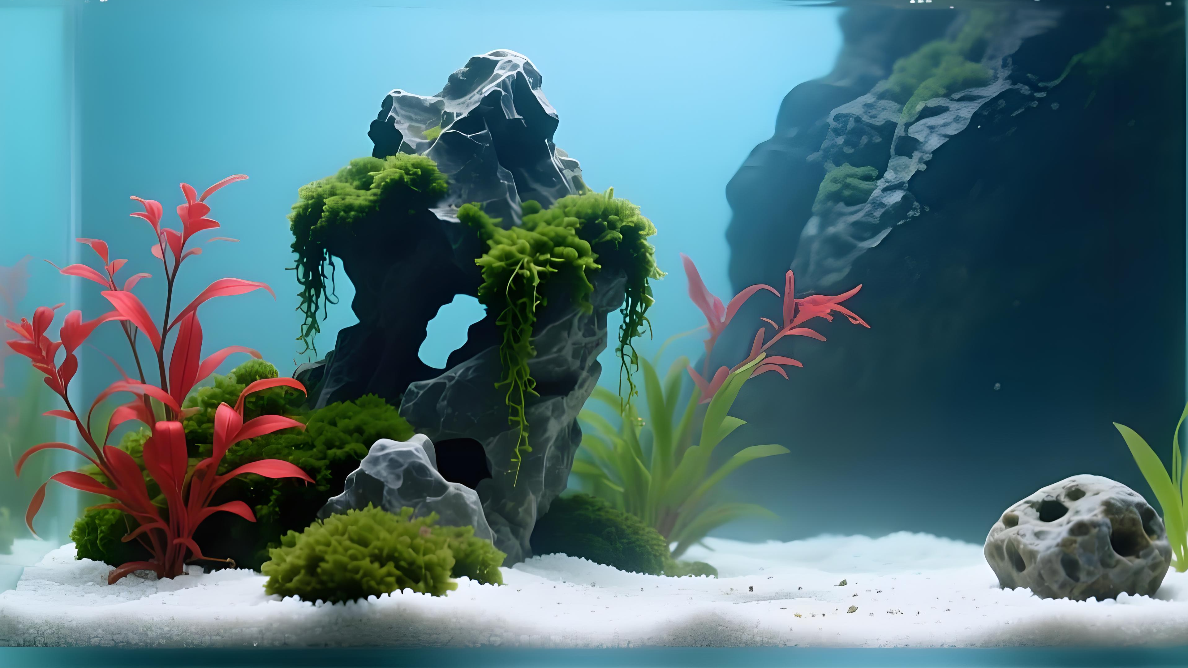 Immerse yourself in the peaceful world of an aquarium with this stunning wallpaper! Vibrant red and green aquatic plants sway gently, while rugged rocks—some with intricate holes and others covered in lush moss—create a natural, layered landscape. The soft, sandy substrate and the calming blue background evoke the serenity of a real underwater habitat. Whether you’re a fish lover or simply crave a touch of nature in your digital life, this wallpaper will transform your screen into a tranquil oasis, bringing calm and beauty to every glance.