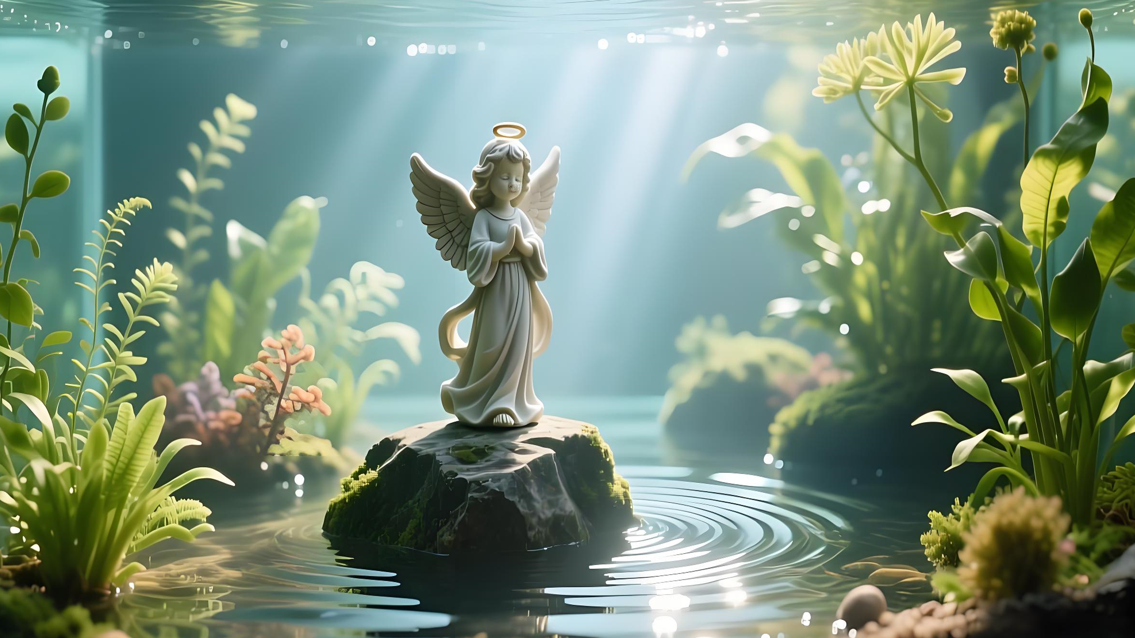 This enchanting aquarium scene centers on a serene angelic figure perched atop a moss - covered rock, its wings outstretched and halo glowing softly. The angel, clad in flowing white robes, exudes a sense of peace and tranquility.