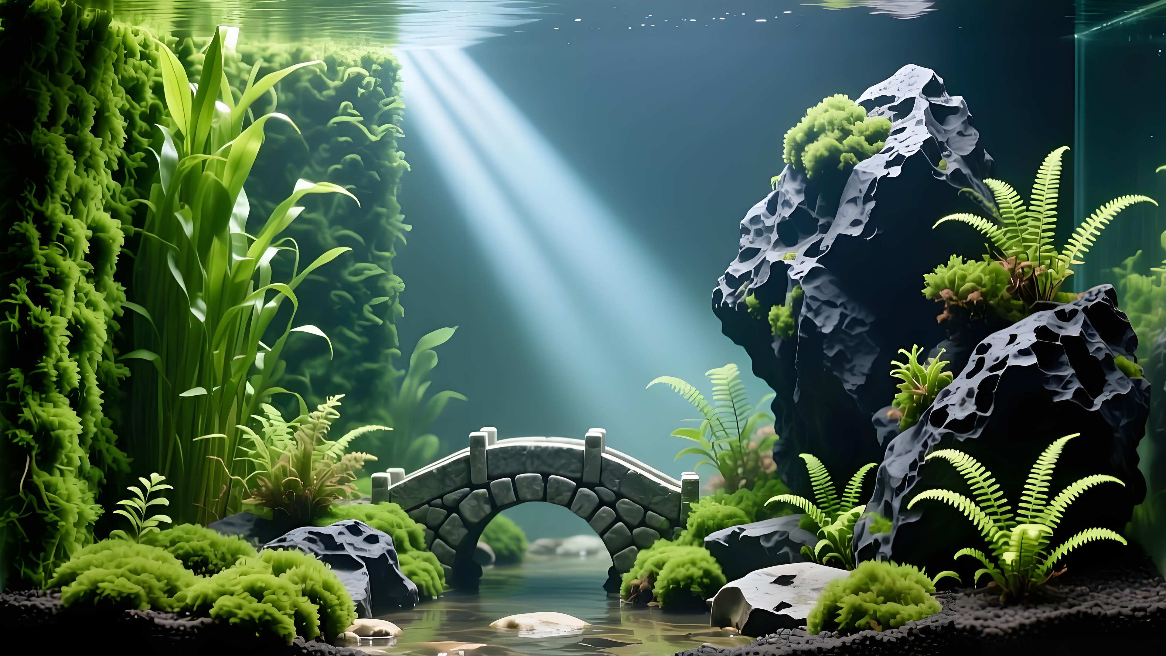 This aquarium scene is a captivating underwater landscape, blending natural elements to create a serene and immersive environment. A stone bridge with an arched opening serves as a focal point, connecting two rocky areas. On the left, a lush green plant with long, slender leaves stands tall, while the right side features dark rocks adorned with vibrant green moss and fern - like plants. Sunlight streams through the water, casting a warm glow and creating a dynamic interplay of light and shadow. The substrate is covered with small, dark pebbles, and patches of green moss - like plants add texture to the base. The overall composition is balanced, with the bridge, plants, and rocks working together to create a tranquil, garden - like atmosphere that is perfect for a calming desktop wallpaper.