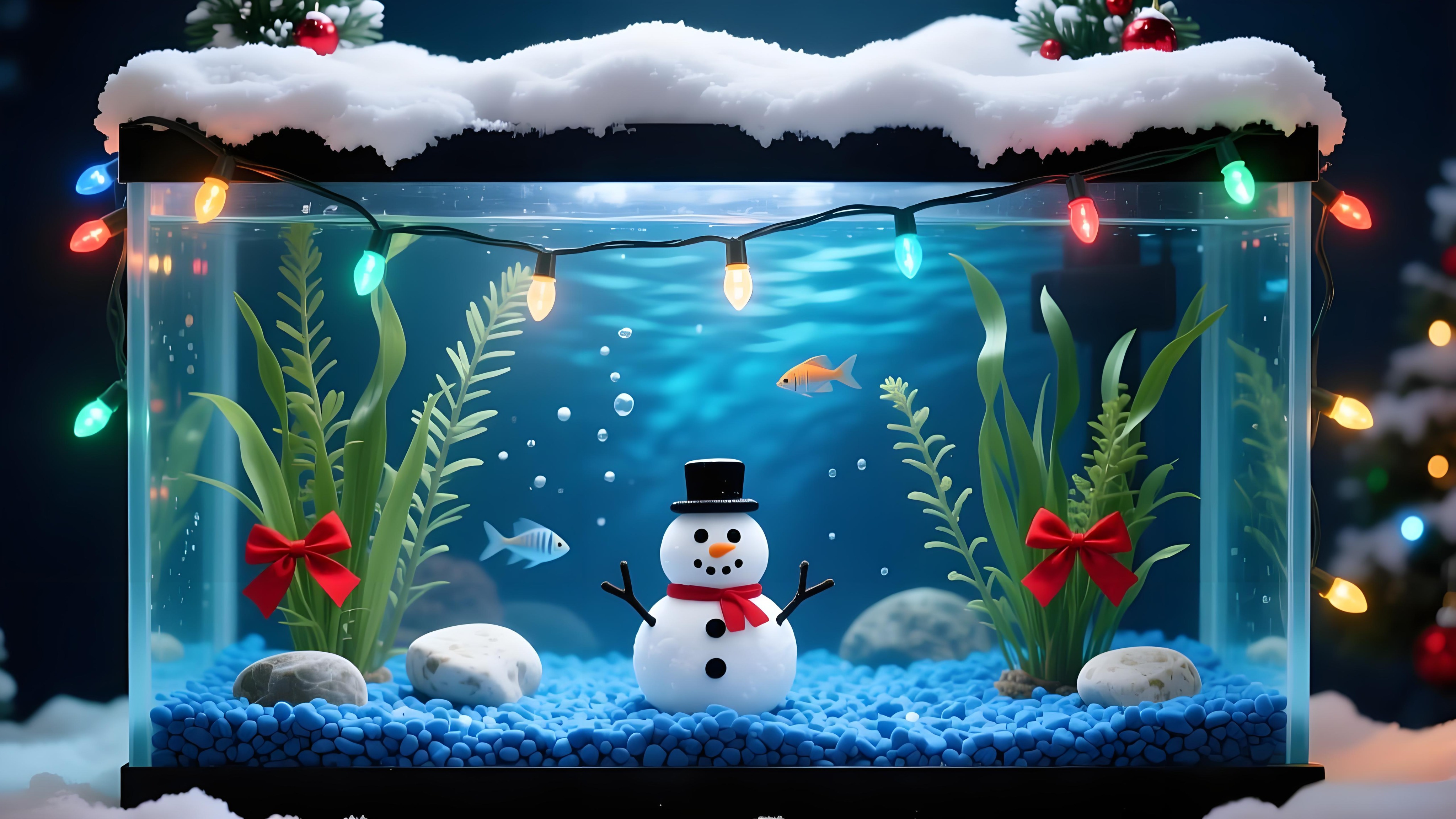 This festive Christmas fish tank wallpaper is a charming blend of winter magic and aquatic serenity. The tank’s top is dusted with "snow," while string lights in red, green, and blue wrap around the edges, casting a warm glow. Inside, vibrant green seaweed sways gently, and small orange and silver fish dart through the water, surrounded by smooth stones and bubbling air. A snowman figurine with a red bow tie stands in the center, flanked by red bows on the seaweed, while blue gravel at the bottom completes the underwater scene. It’s a perfect blend of holiday cheer and calming aquatic life, ideal for brightening your desktop this winter.