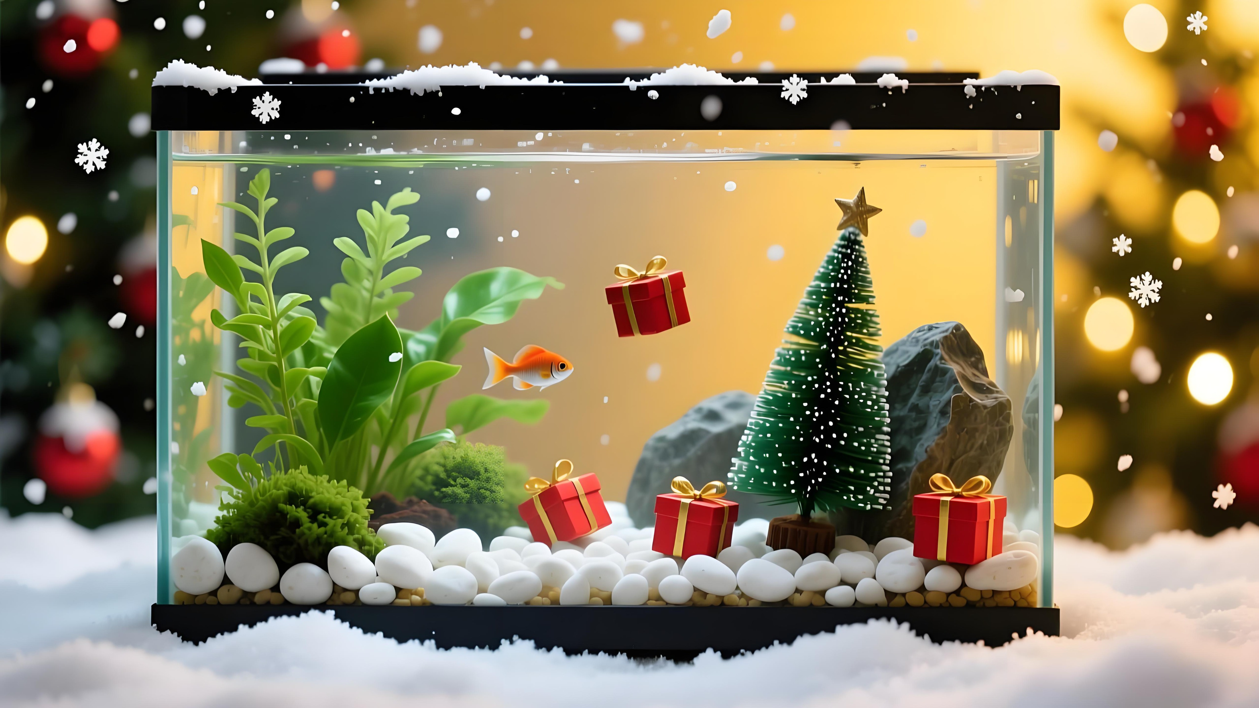 This charming Christmas-themed fish tank desktop wallpaper features a vibrant goldfish swimming gracefully in a transparent tank, surrounded by festive decorations. Lush green water plants sway gently in the background, while a miniature Christmas tree with a red bow and golden star stands tall on the right, accompanied by a cluster of colorful gift boxes. Snowflakes and holiday lights add a magical, wintry atmosphere, making it a perfect blend of aquatic serenity and seasonal cheer. The clear tank and bright colors create a lively, eye-catching scene that will bring festive spirit to any computer screen, ideal for the holiday season.