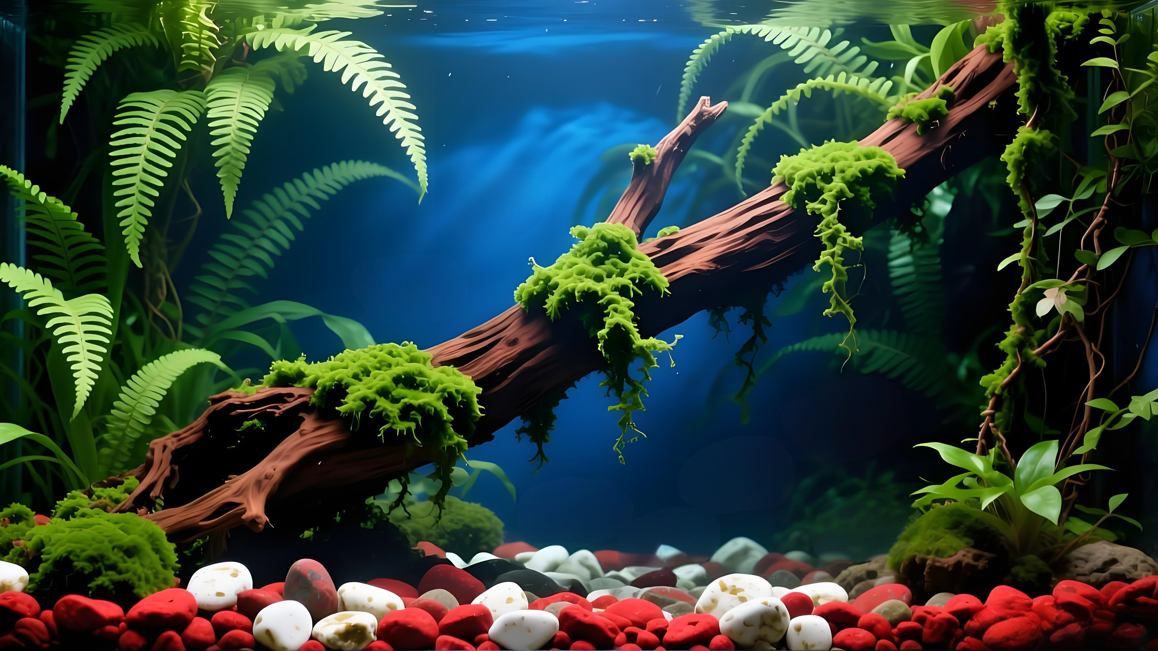 This vibrant aquarium scene captures the essence of a forest - like underwater world. A large, intricately branched tree trunk, covered in lush green moss, serves as the centerpiece, evoking the feel of a fallen tree in a woodland. Surrounding the trunk are vibrant ferns with delicate, feathery leaves, adding to the natural, forest - like ambiance.