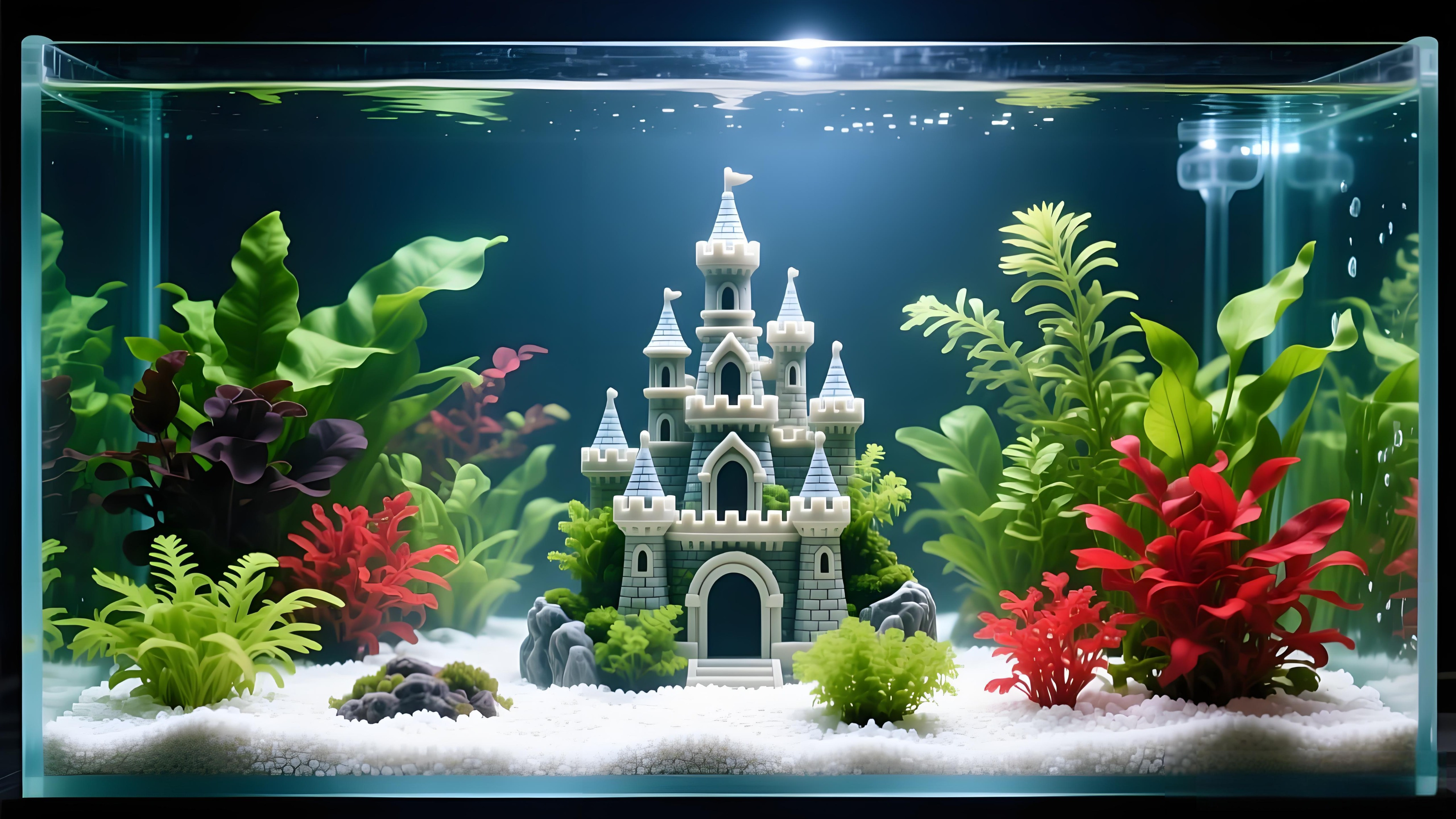 This aquarium setup is a whimsical, fantasy - inspired underwater scene. A white castle with turrets and a flag serves as the central focal point, surrounded by a vibrant array of aquatic plants in various colors (green, red, purple, etc.). The base is covered in white substrate, adding a clean, bright contrast to the colorful plants. The combination of the castle’s fantastical design and the lush, diverse plant life creates a playful, imaginative environment that feels like a miniature underwater kingdom.