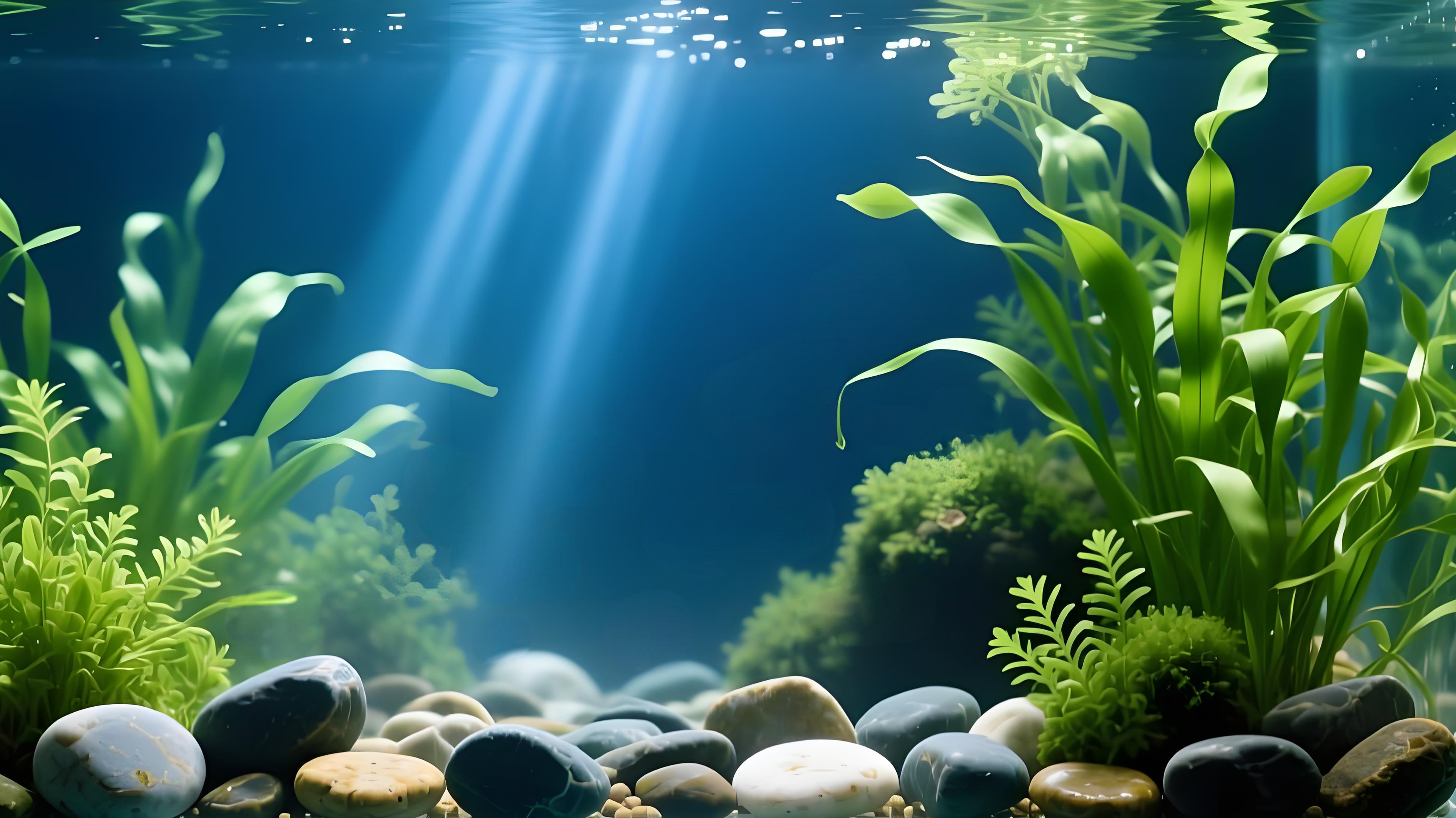 Dive into a mesmerizing underwater haven with this stunning aquarium wallpaper! Sunlight streams through the crystal-clear blue water, casting radiant beams that illuminate the scene. Lush, vibrant aquatic plants—feathery green leaves and bushy foliage—sway gracefully, creating a lush underwater forest. Smooth, colorful pebbles of various shades rest at the bottom, adding texture and natural charm. The entire composition exudes serenity, making it the perfect backdrop to transform your digital space into a calming retreat. Let this tranquil underwater world bring peace and beauty to your screens!