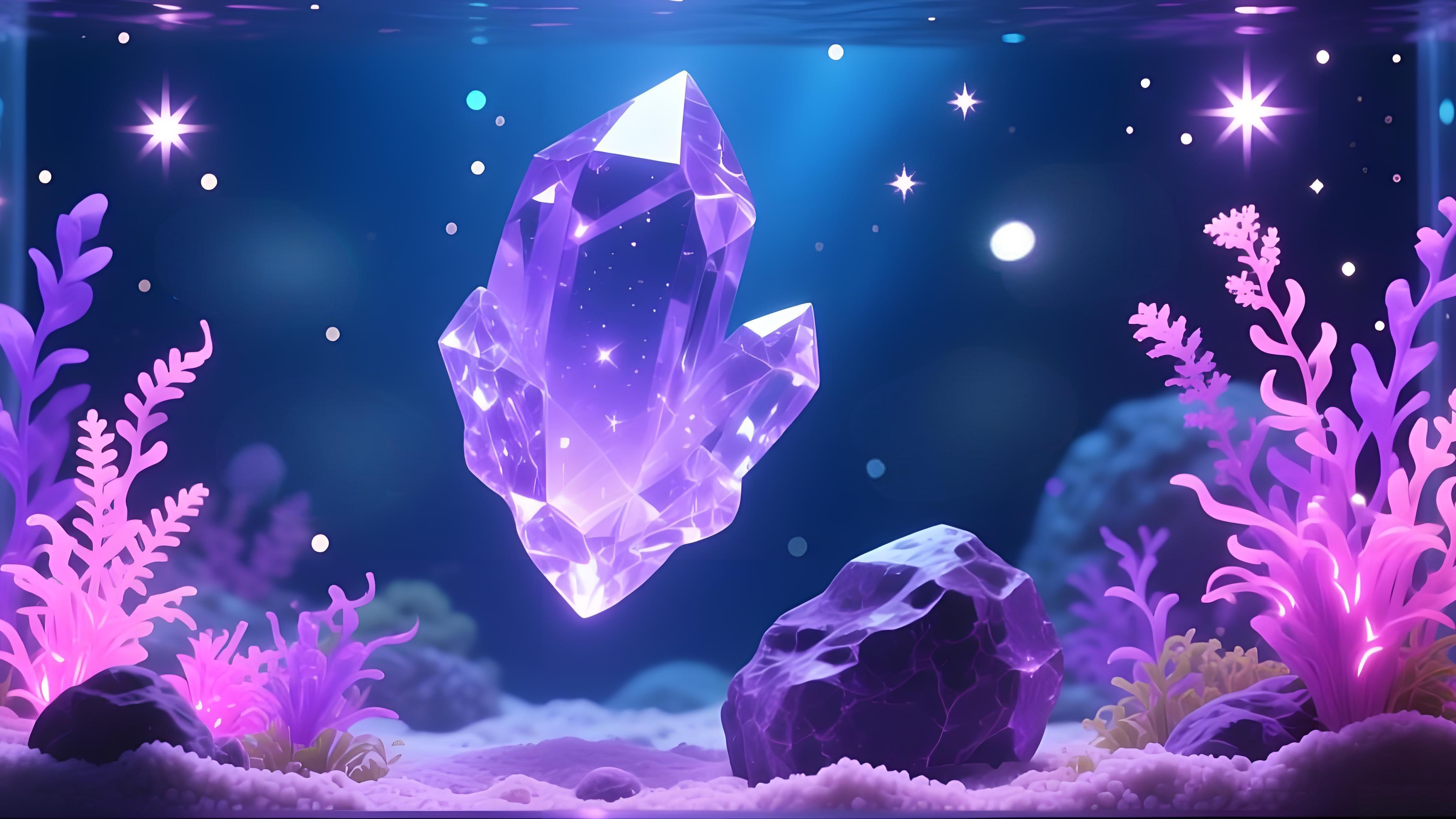 This enchanting computer wallpaper transports you to an underwater realm like no other. At the heart of the scene floats a magnificent, luminous purple crystal, radiating an ethereal glow that illuminates the surrounding waters. The crystal's intricate facets sparkle with inner light, creating a mesmerizing focal point. Below, the ocean floor is adorned with smooth, dark rocks and delicate, vibrant purple coral formations that sway gently in the current. The backdrop is a deep, mysterious blue, dotted with twinkling stars and a soft, glowing moon, adding a touch of celestial magic to the underwater landscape. This wallpaper is perfect for adding a splash of vibrant color and a sense of wonder to your desktop, making every glance a captivating experience.
