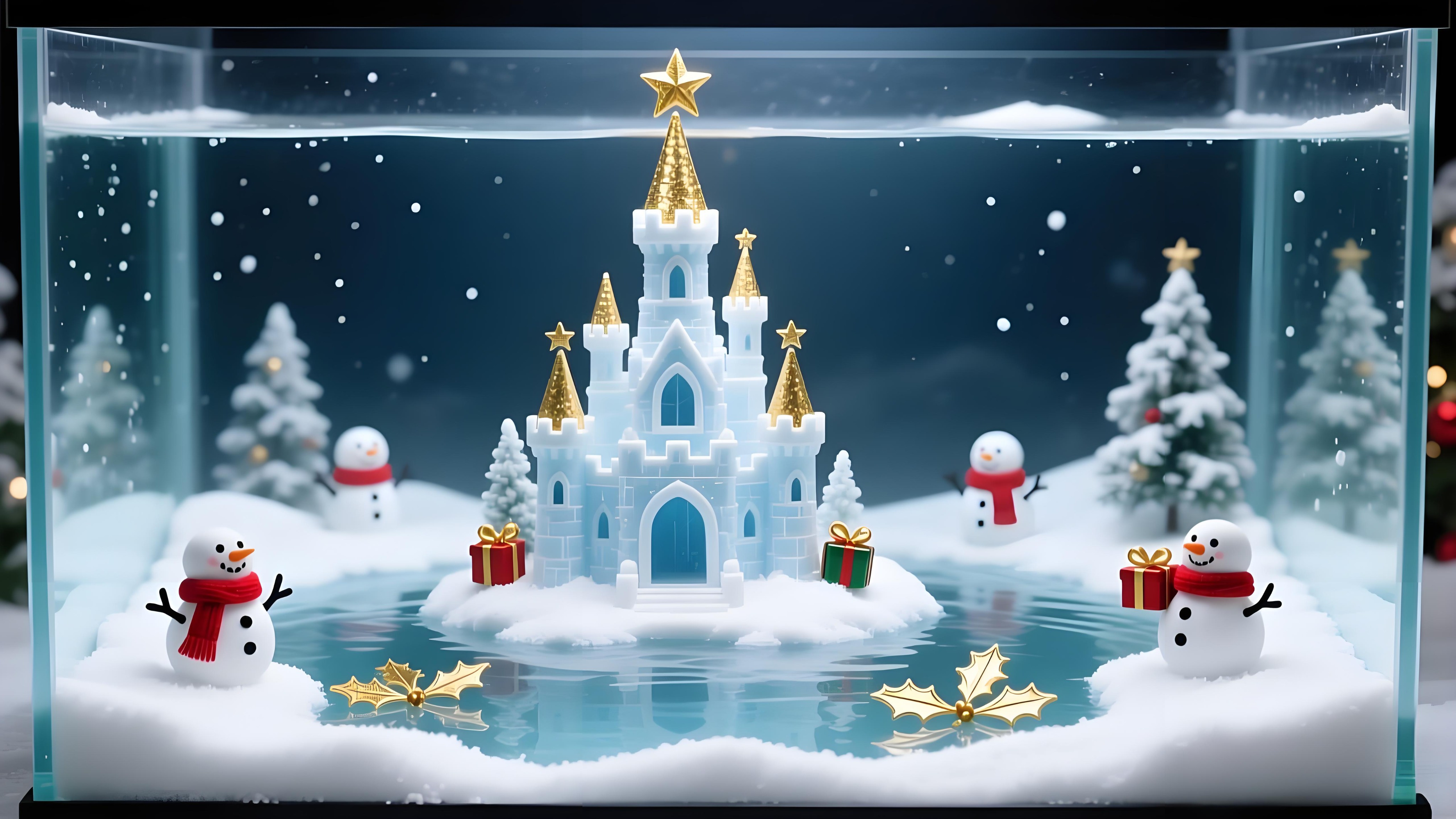 This enchanting Christmas-themed computer wallpaper features a magical winter scene. At its center is a snow-covered castle with a blue arched door, golden spires, and a star-topped turret, surrounded by a frozen lake. Snowflakes gently fall, and the background is a starry night sky. Miniature snowmen in red scarves, gift boxes, and evergreen trees with golden stars line the edges, creating a whimsical, festive atmosphere. The transparent display box adds a sleek, modern touch, making it ideal for wallpaper, immersing users in holiday magic.