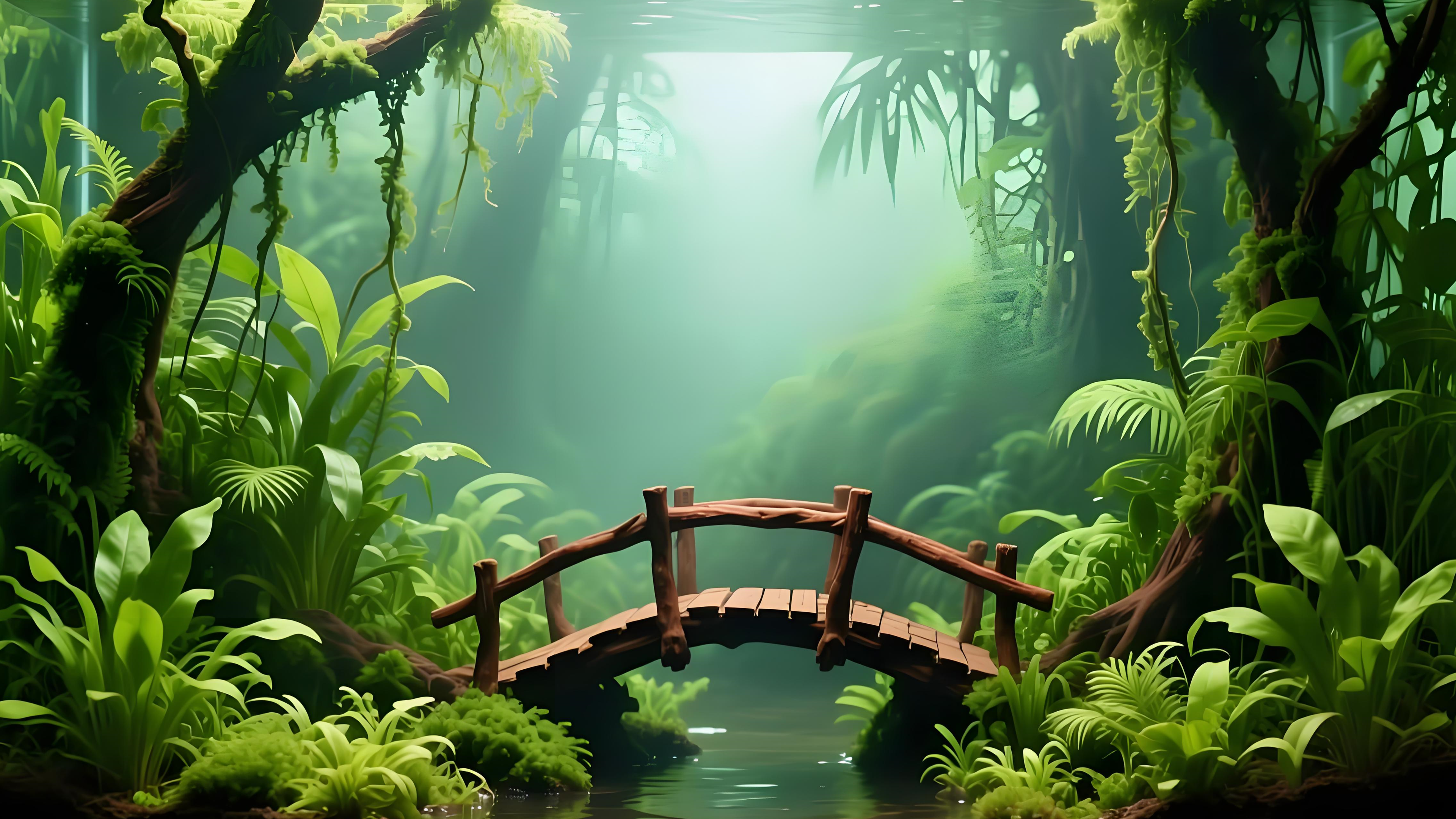 This aquarium scene is a lush, enchanted aquatic forest. At its center is a moss - covered wooden bridge, its rustic structure and green moss adding a sense of age and natural beauty.