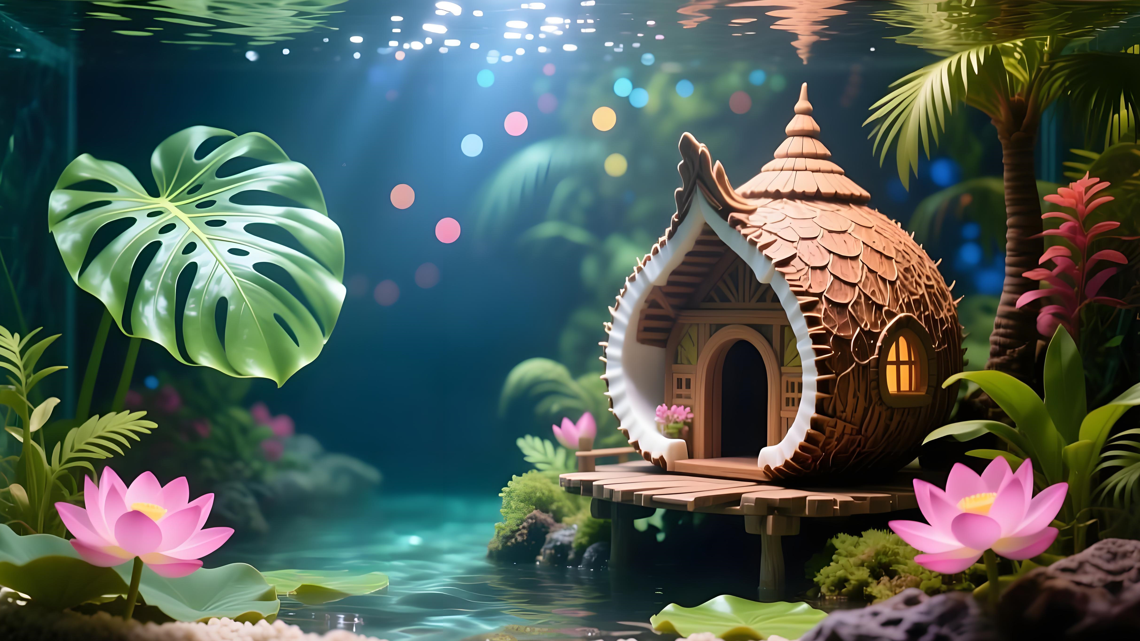 The water is a clear, light blue, with sunlight filtering through the surface and creating a tranquil, peaceful atmosphere. The background is filled with bokeh lights, adding a magical, dreamy quality to the scene. The interplay of the house, tropical plants, and bokeh lights creates a captivating, serene scene that evokes the beauty and tranquility of a hidden tropical paradise.
