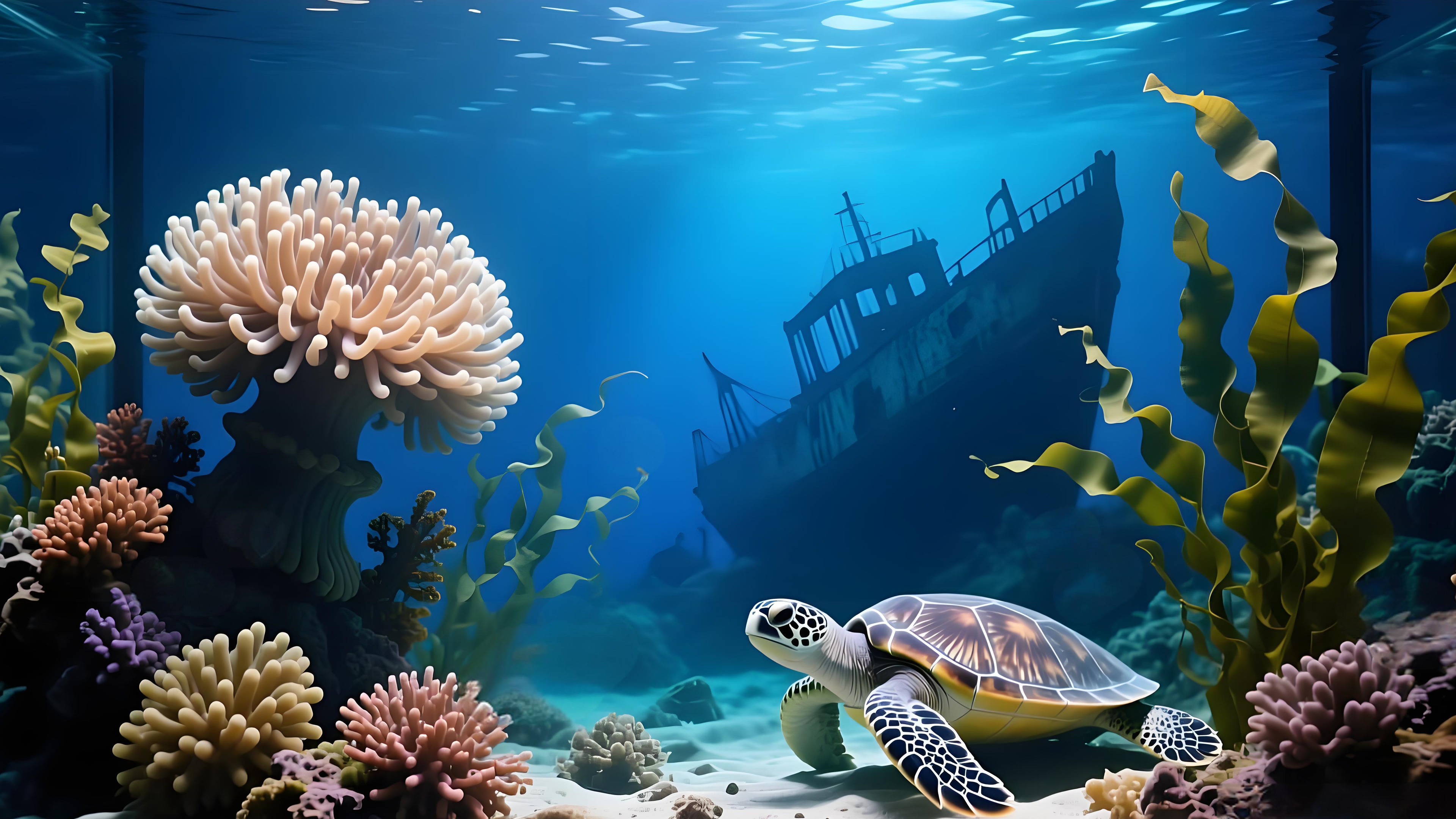 This image presents a vivid underwater aquarium scene, serving as a fish tank wallpaper and computer wallpaper. It features a shipwreck, colorful coral reefs, lush aquatic plants, and a sea turtle, all rendered in high - detail. As a free download option, it offers 4K resolution to ensure sharp visuals. When used as a custom background for fish tank screensavers, it creates an immersive underwater environment, enhancing the tank’s aesthetic appeal and making it feel like a thriving marine ecosystem.