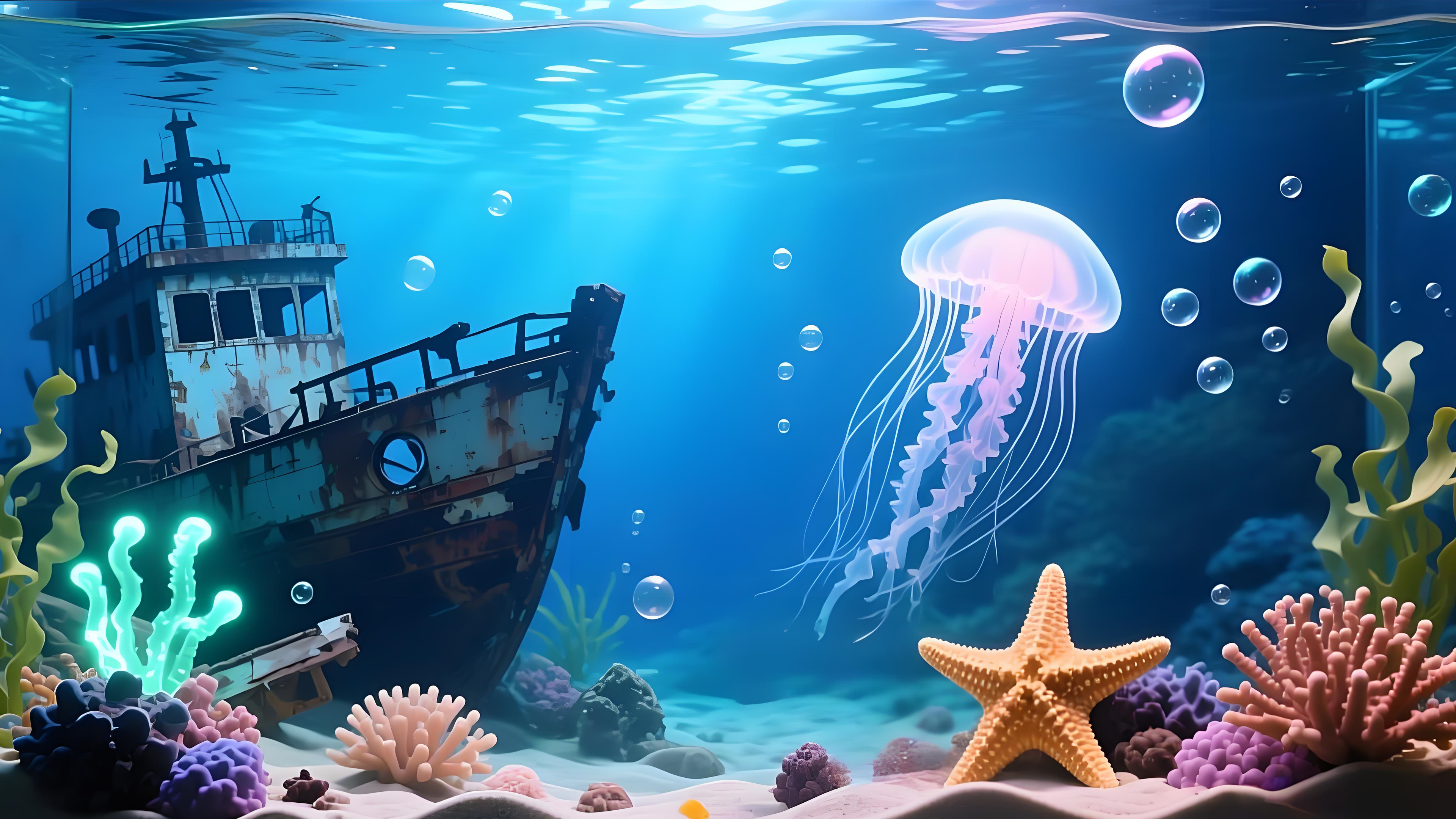 A glowing green plant stands out with its luminous hue, creating a striking contrast against the other elements. A jellyfish with a translucent, glowing body and delicate tentacles floats gracefully, adding a sense of wonder and movement. A starfish rests on the sandy bottom, contributing to the natural, oceanic feel. Bubbles rise from the shipwreck and other elements, enhancing the sense of underwater life. The water is a clear, light blue, with sunlight filtering through the surface, creating a serene and tranquil atmosphere. The interplay of the shipwreck, colorful corals, glowing plant, jellyfish, and starfish creates a captivating, peaceful scene that evokes the beauty and mystery of the ocean.