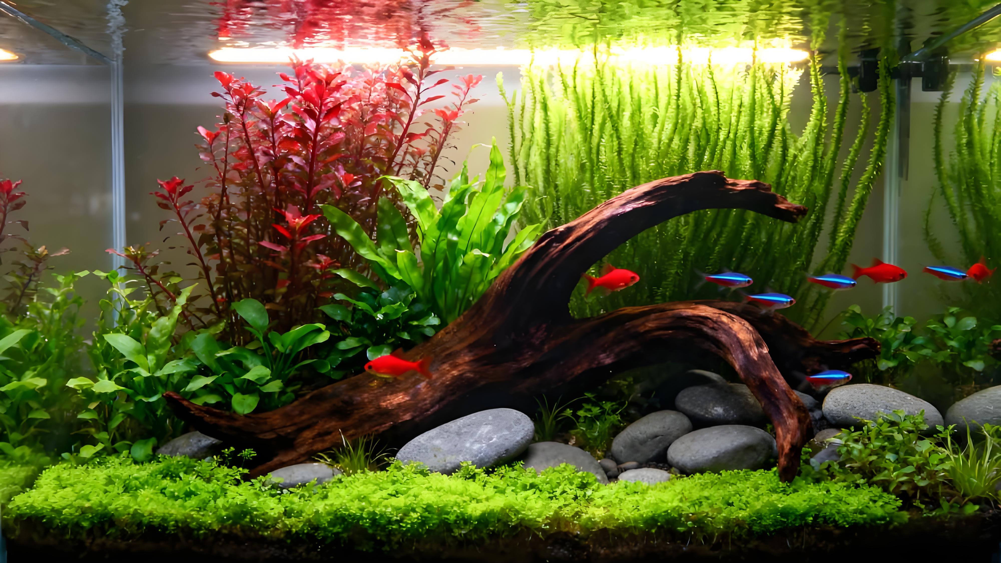 Diverse Aquatic Life – A rich array of colorful corals, seaweeds, and other marine plants surrounds the driftwood. The corals come in bright shades of orange, pink, purple, and green, while the seaweeds add flowing, leafy textures. Some plants even emit a soft glow, adding a magical touch.