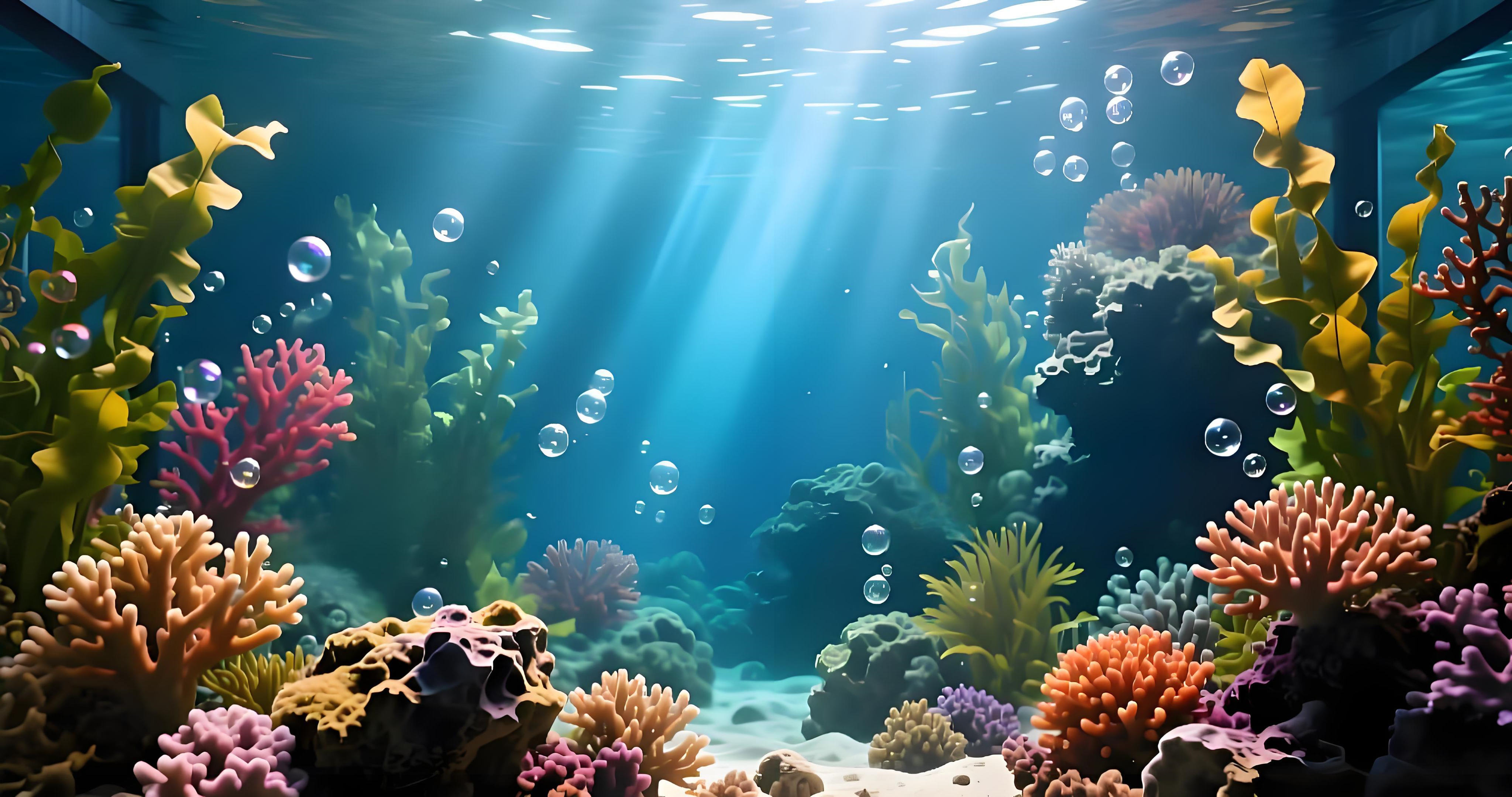 Immerse yourself in this mesmerizing aquarium background, where sunlight filters through crystal-clear water, casting a golden glow over lush green seaweed and vibrant coral formations in hues of pink, orange, and purple. Bubbles rise lazily, creating a dynamic yet serene scene that mimics the tranquility of a thriving underwater ecosystem. Perfect for wallpaper, design projects, or relaxation, this image transports you to a world of calm and wonder. Whether you're seeking a visual escape for your desktop or a creative spark for your next project, this enchanting aquatic scene is a must-have. Download now and bring this enchanting aquatic world to your screen!