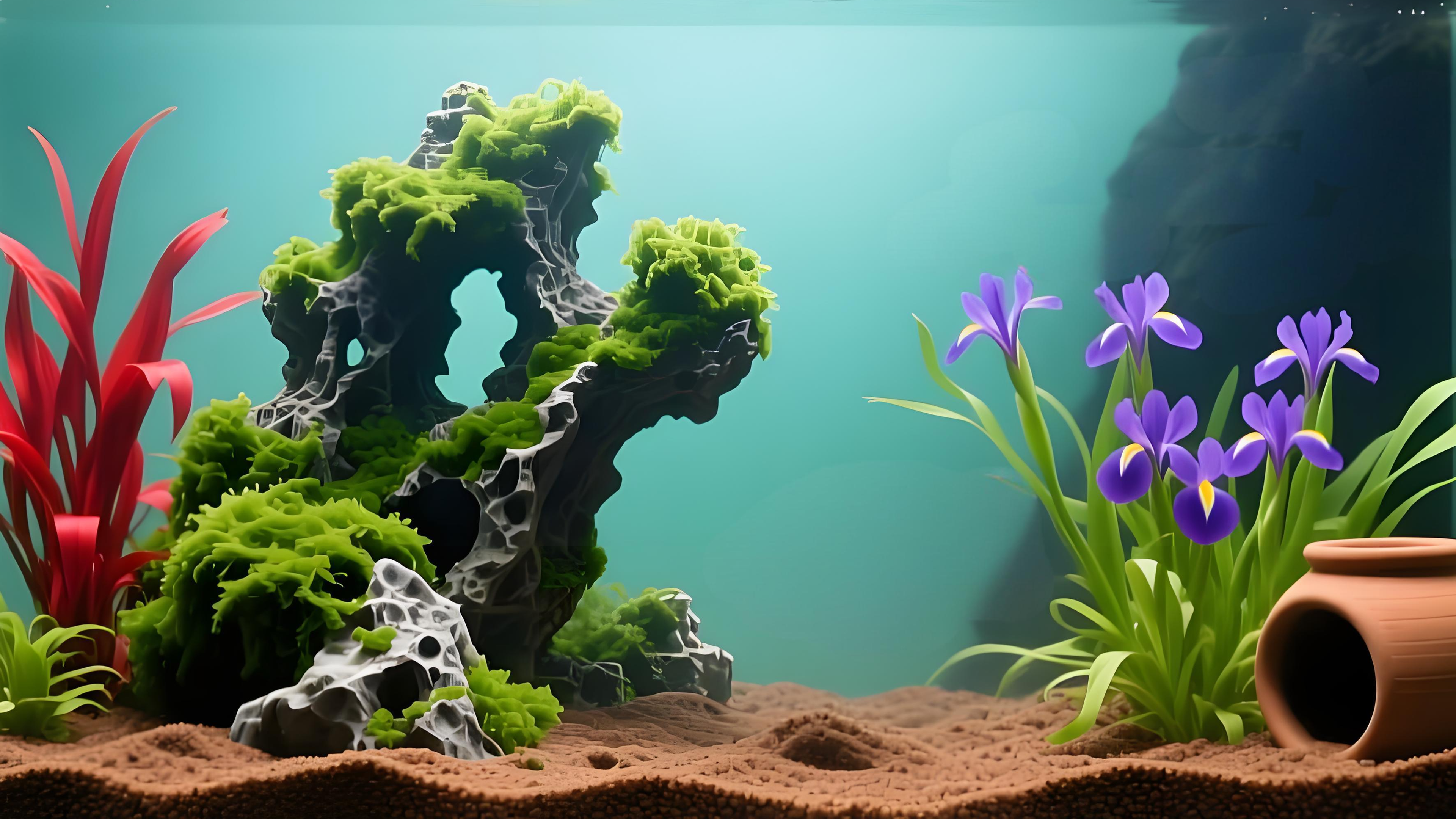 This mesmerizing computer wallpaper is a vibrant underwater scene that feels like a slice of nature brought to life on your screen. At the center, a dramatic rock formation—covered in lush green moss—commands attention, its intricate holes and textures adding depth and intrigue. To the left, vibrant red aquatic plants with long, flowing leaves create a striking contrast against the greenery. On the right, a cluster of purple irises with delicate yellow centers blooms beautifully, their bright petals standing out against the earthy tones of the sandy substrate. A terracotta pot rests nearby, adding a rustic touch to the scene. The background is a soothing gradient of teal water, with a dark, textured rock formation adding a sense of depth and mystery. This wallpaper is a perfect choice for anyone who loves nature-inspired aesthetics and wants to bring a touch of aquatic beauty to their digital space.